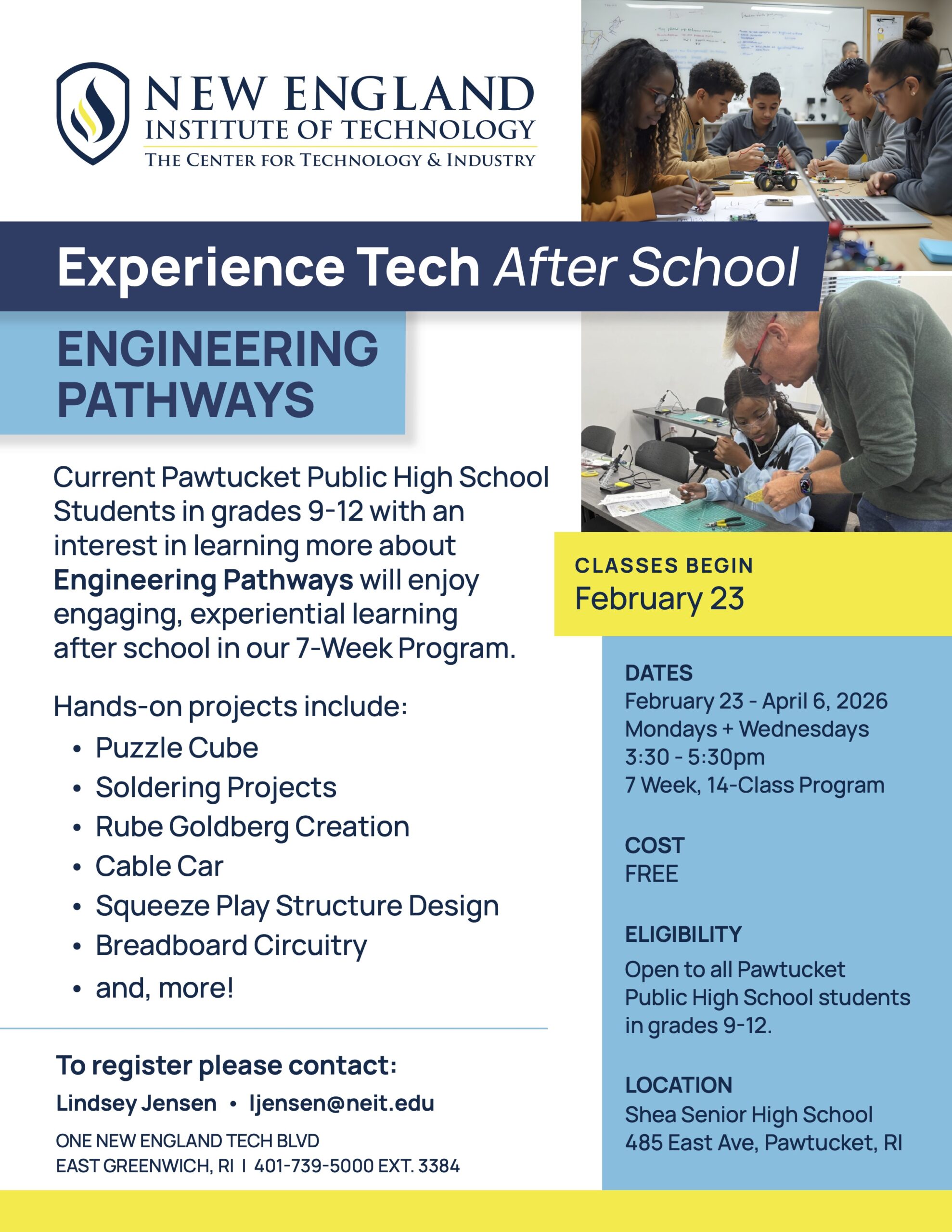 Experience Tech After School Program Pawtucket High School students in grades 9-12 with an interest in learning more about Engineering Pathways can join this free Read More »