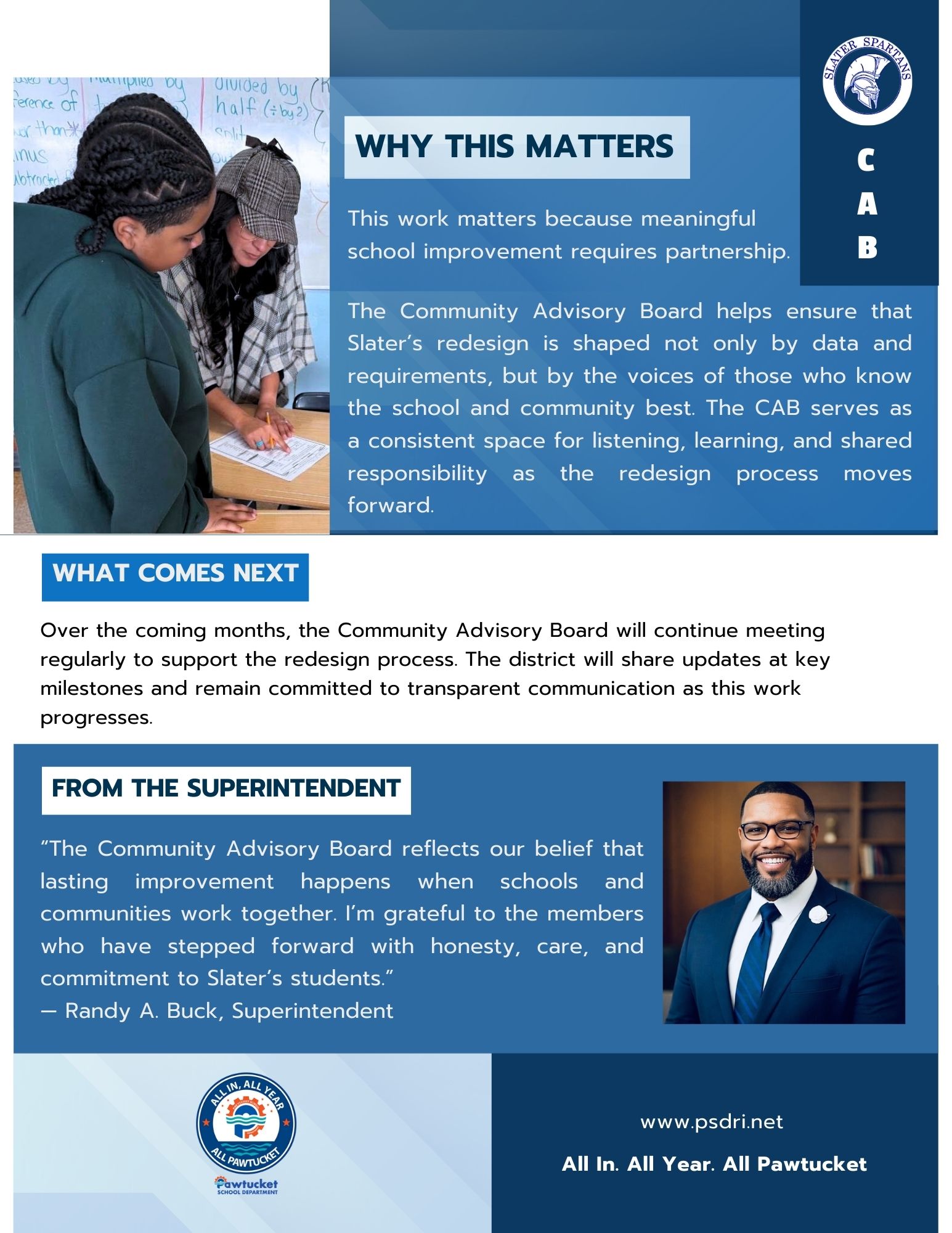 The Pawtucket School Department has launched the Slater Middle School Community Advisory Board as part of the school’s redesign process. The CAB brings together families, students, educators, and community members to ensure community voice, transparency, and shared responsibility are central to this work. More information will be shared as the process continues.